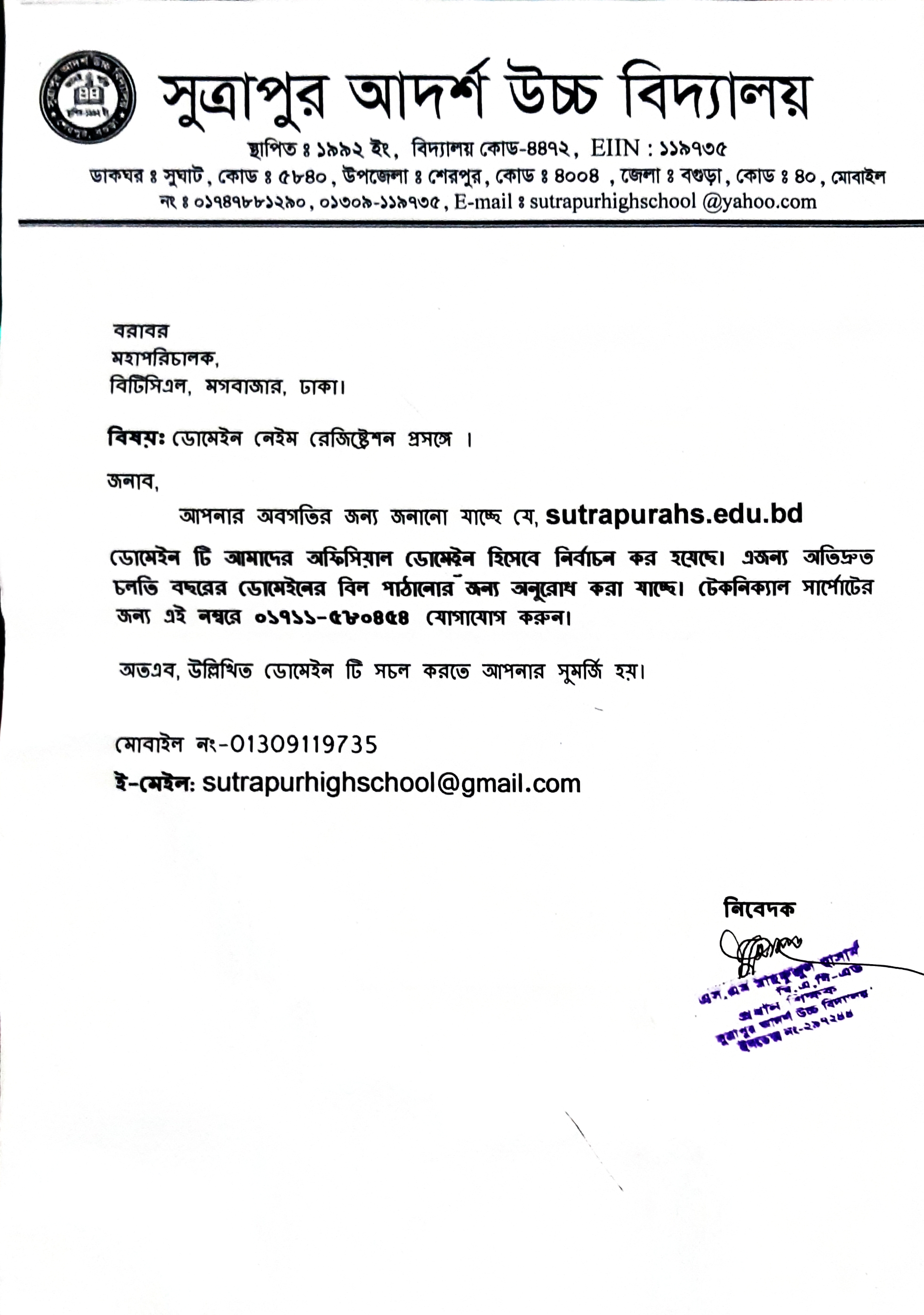 EIIN No : ১১৯৪২০, কলেজ কোডঃ ৪২৫৪ , স্কুল কোডঃ ৪৬০৪, থানা কোড: ৪০০৮,জেলা কোড: ৪০ স্থাপিত:- ১৯৭০ ইং